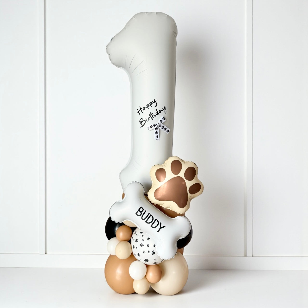 This adorable design features a large foil number paired with paw print details, a bone balloon personalised with your pet’s name, and coordinating neutral tones for that picture-perfect look.
